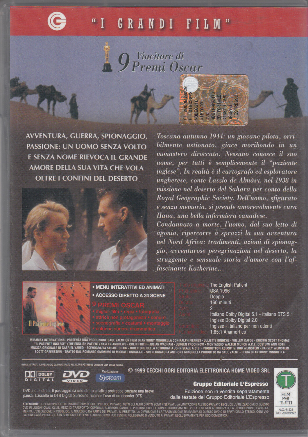 | Cast: | Willem Dafoe,Ralph Fiennes,Juliette Binoche,Kristin Scott Thomas,Naveen Andrews,Colin Firth,Julian Wadham,Jurgen Prochnow,Kevin Whately,Clive Merrison,Torri Higginson,Nino Castelnuovo,Anthony Minghella |