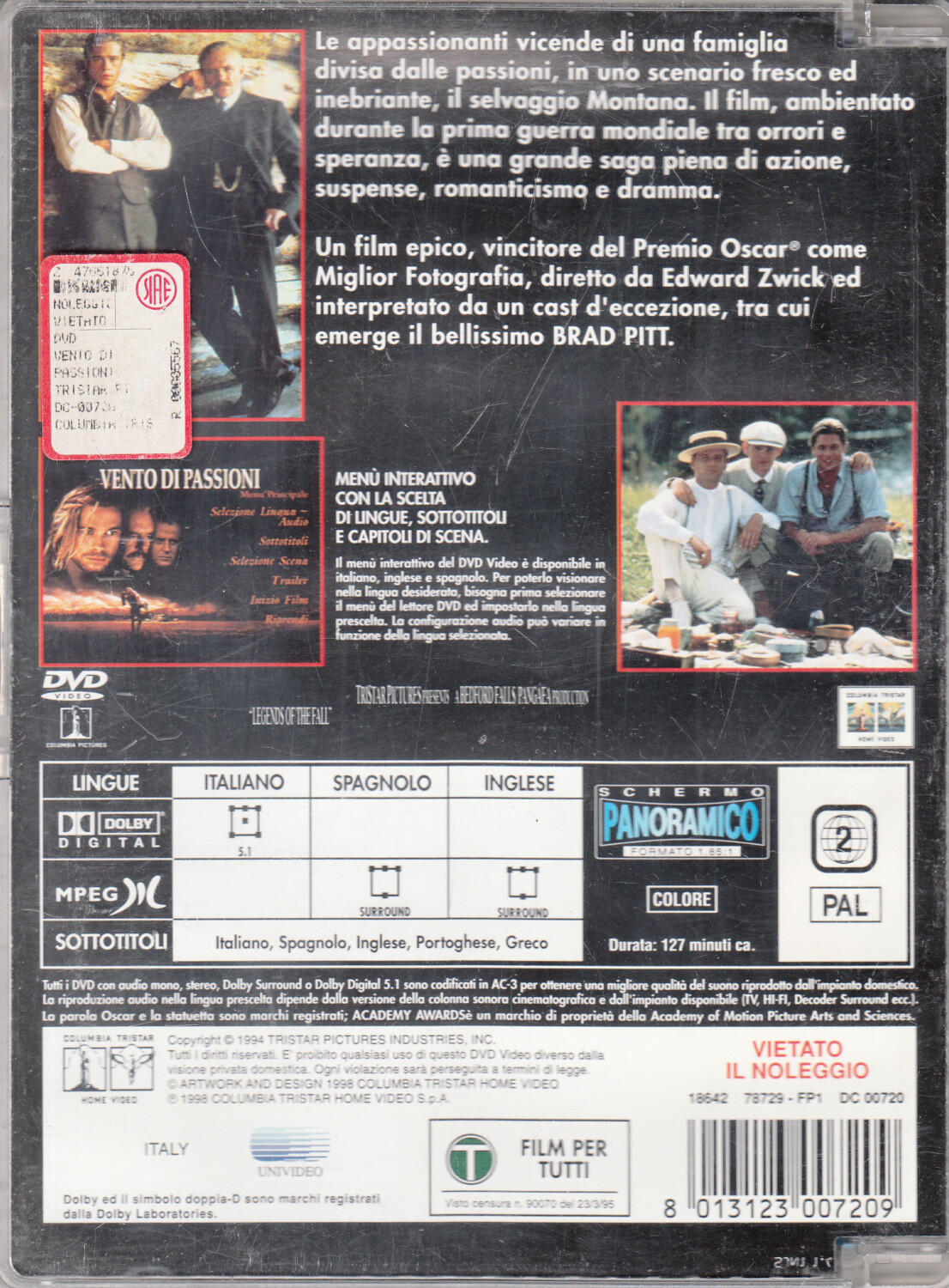 | Titolo: | Vento di passioni con Brad Pitt, Anthony Hopkins. DVD in Italiano. Custodia Jewel Box |