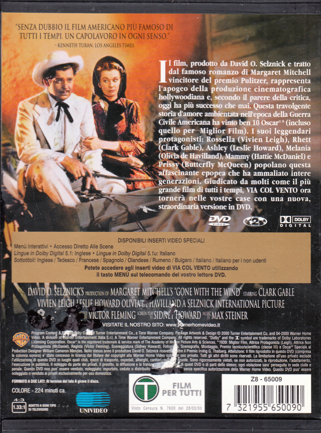 Via col vento (Vivien Leigh, Clark Gable) DVD in Italiano – Custodia Snapper