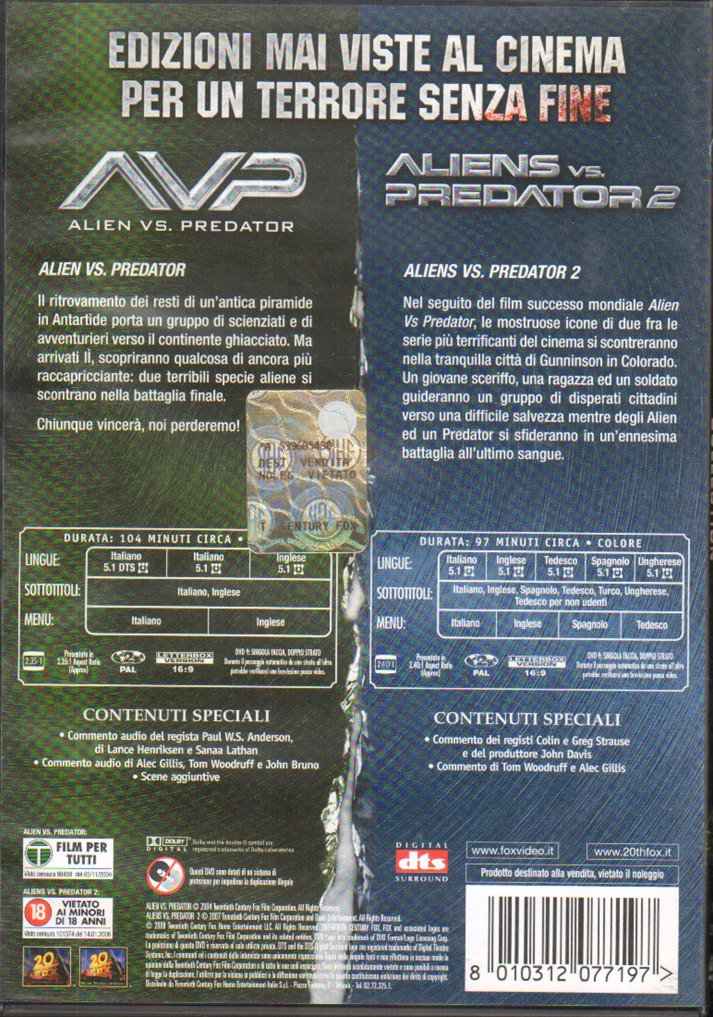 Condizioni dischi: 6 Dischi sono Come Nuovi (Nessun graffio, perfettamente funzionanti), mentre i restanti 2 dischi (AVP 1 e 2) cono in Condizioni Ottime (Presentano qualche leggerissimo graffietto, perfettamente funzionanti)--- Custodie: Condizioni Ottime --- Libretti non presenti (fogli cartacei interni con i dati del DVD). Con cofanetto in cartoncino.