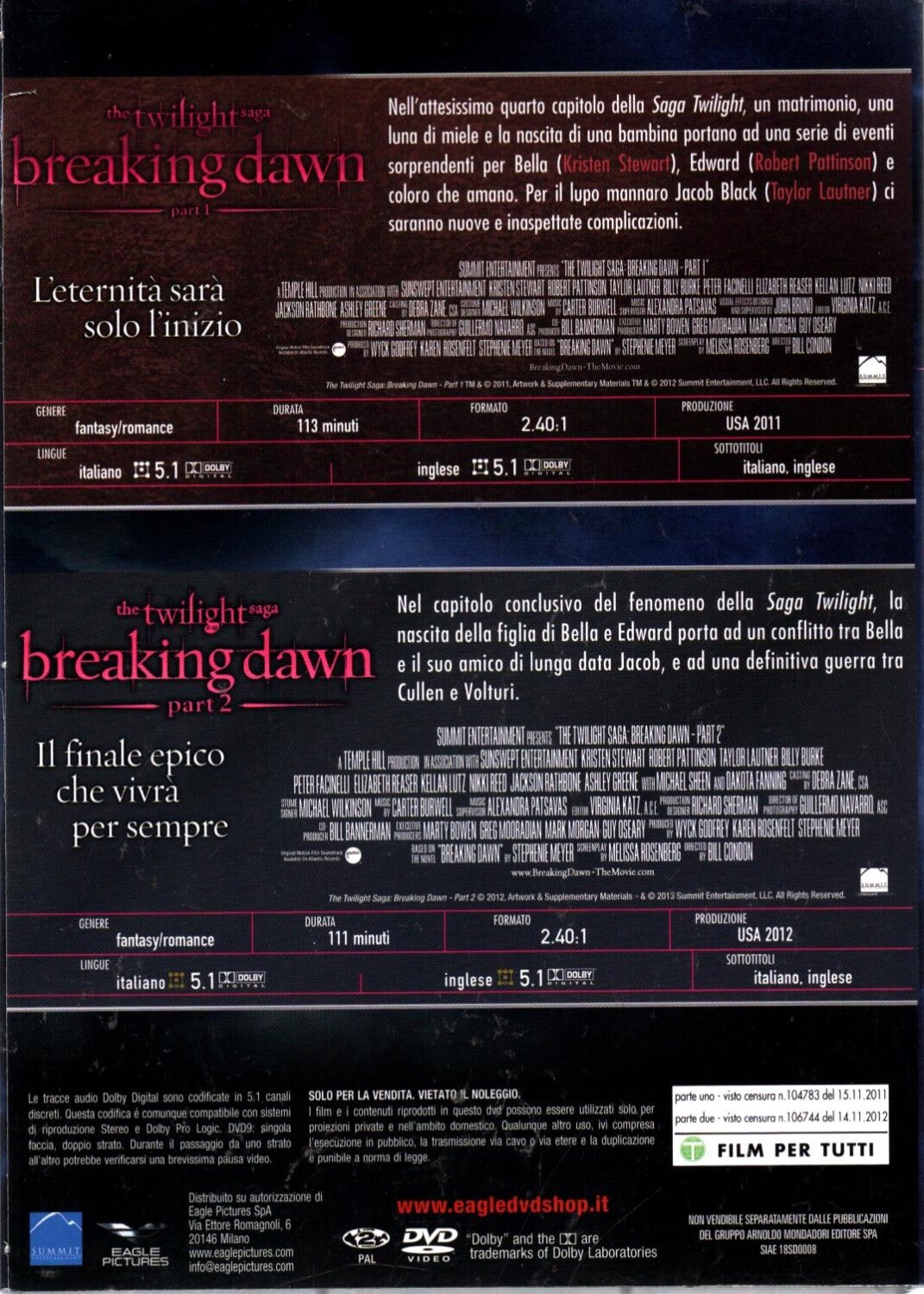 | Titolo: | The Twilight Saga Breaking dawn Part 1 -2 con 2 DVD in Italiano Versione da edicola |