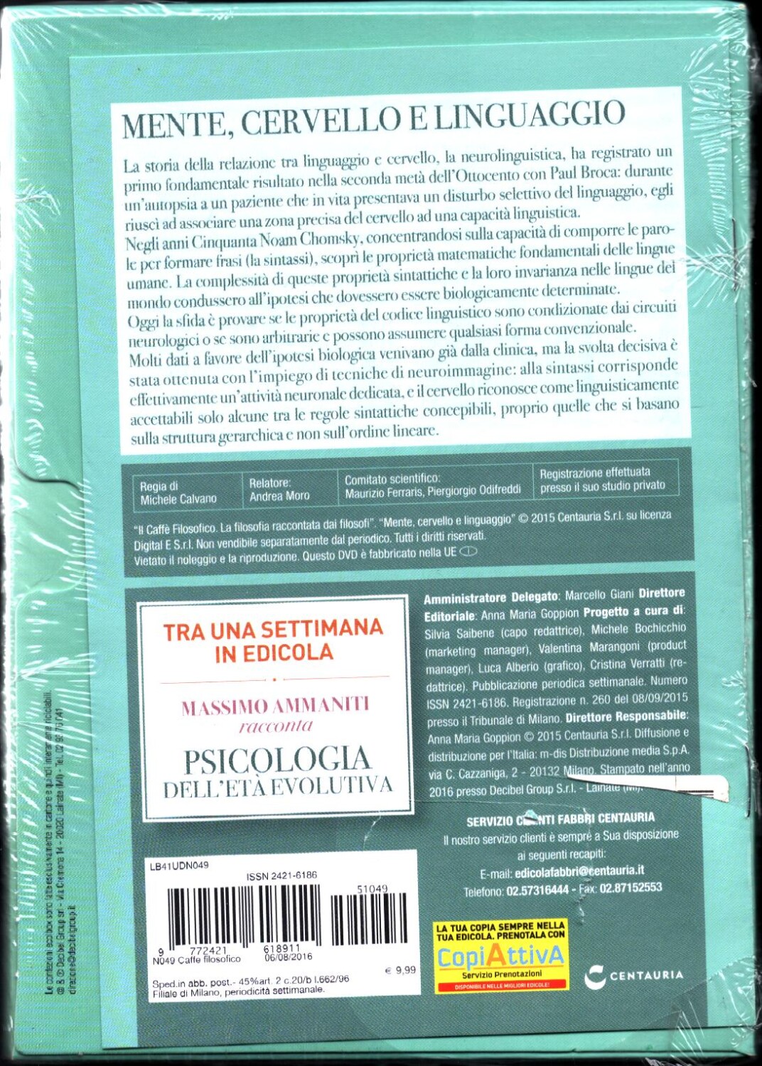 | Titolo: | Il Caffe’ Filosofico. Andrea Moro racconta Mente Cervello e Linguaggio. DVD in Italiano. Versione da edicola |