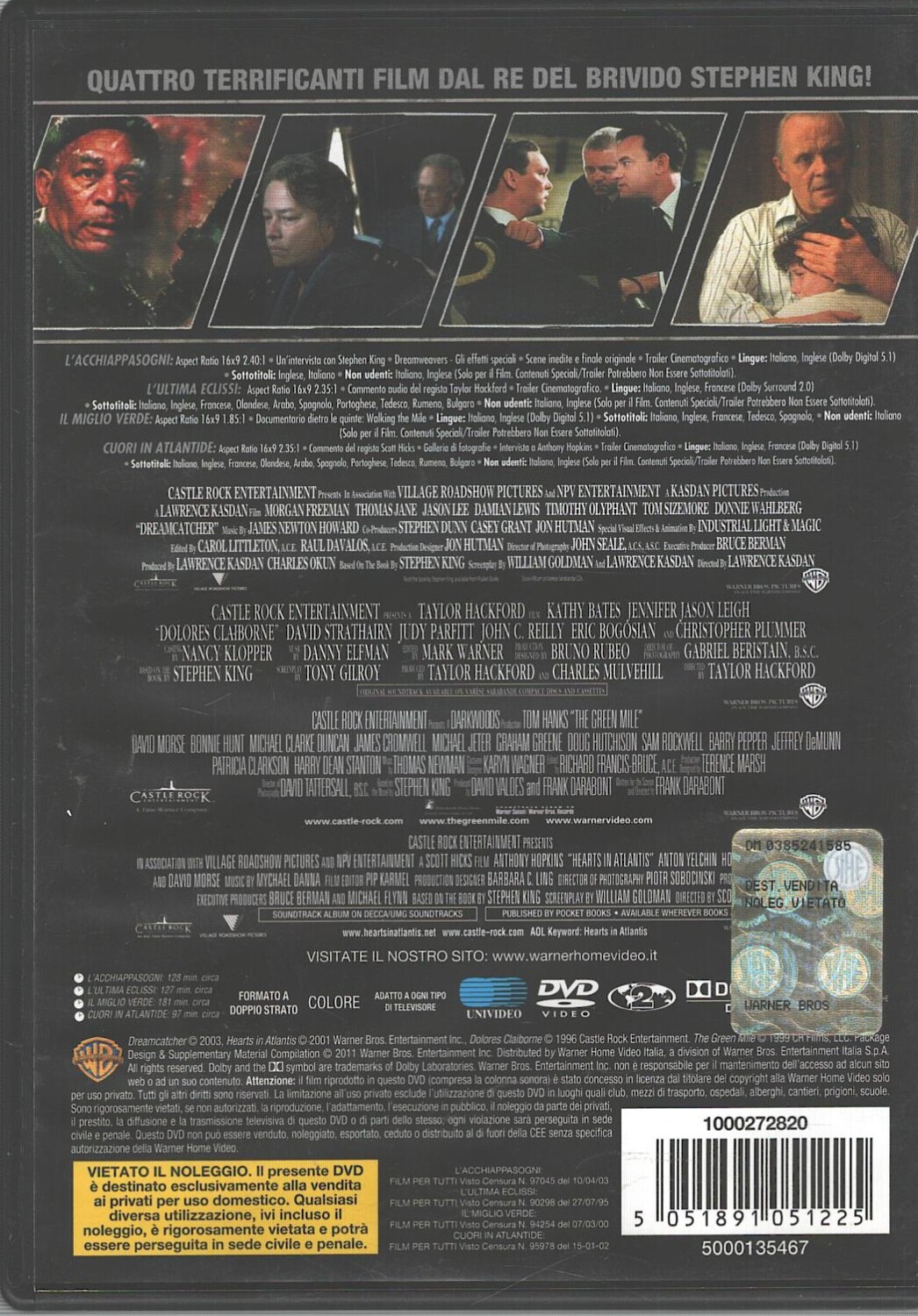 | Titolo: | 4 Grandi Film – King of horror (4 DVD) – DVD in Italiano (L’acchiappasogni, Il miglio verde, L’ultima eclissi, Cuori in Atlantide) |