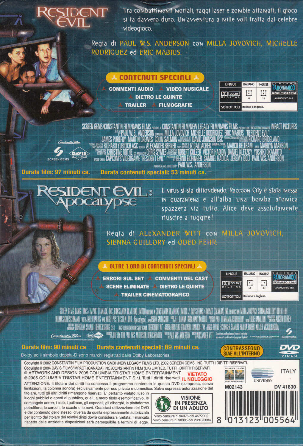 | Titolo: | Resident Evil, Resident Evil Apocalypse. Raccolta di 2 film con n. 2 DVD in Italiano con Cofanetto |