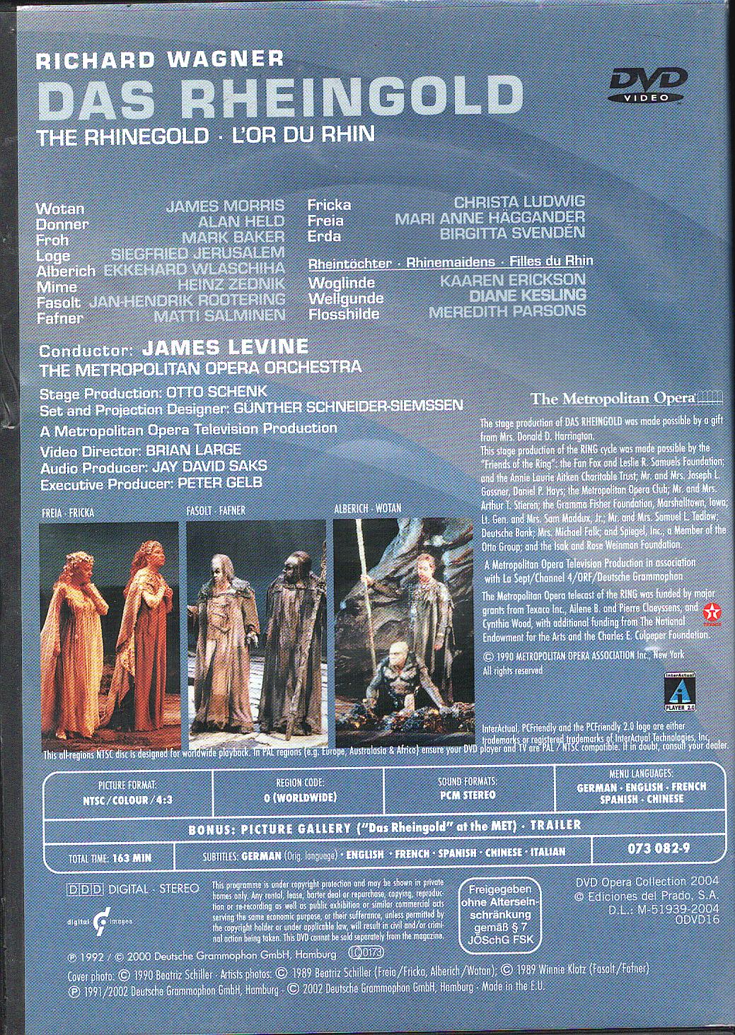 | Titolo: | Das Rheingold. (The Rhinegold) Richard Wagner. Opera completa (1 DVD) James Morris (Edizione NTSC Regione 0, Lingua Tedesco, Sottotitoli Inglese, tedesco, francese, italiano, spagnolo, cinese) Versione da edicola |