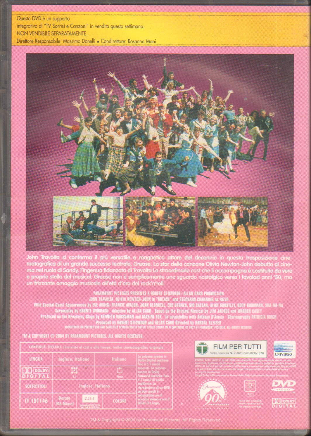 | Titolo: | Grease con John Travolta e Olivia Newton John. DVD in italiano. Versione da edicola |