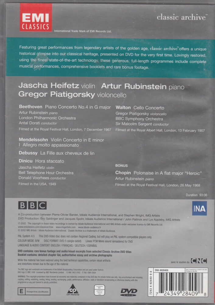 | Titolo: | Heifetz, Rubinstein, Piatigorsky Classic Archive EMI DVD in Inglese |