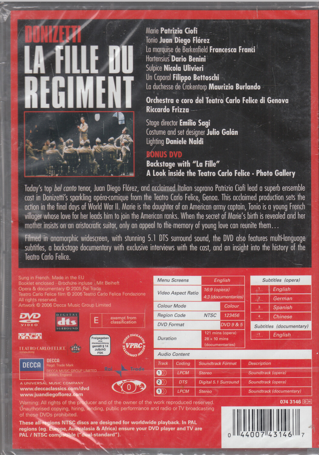| Titolo: | La Fille Du Regiment di Donizetti con Juan Diego Florez. DVD Edizione Stati Uniti NTSC Regione 0, Lingua Inglese |