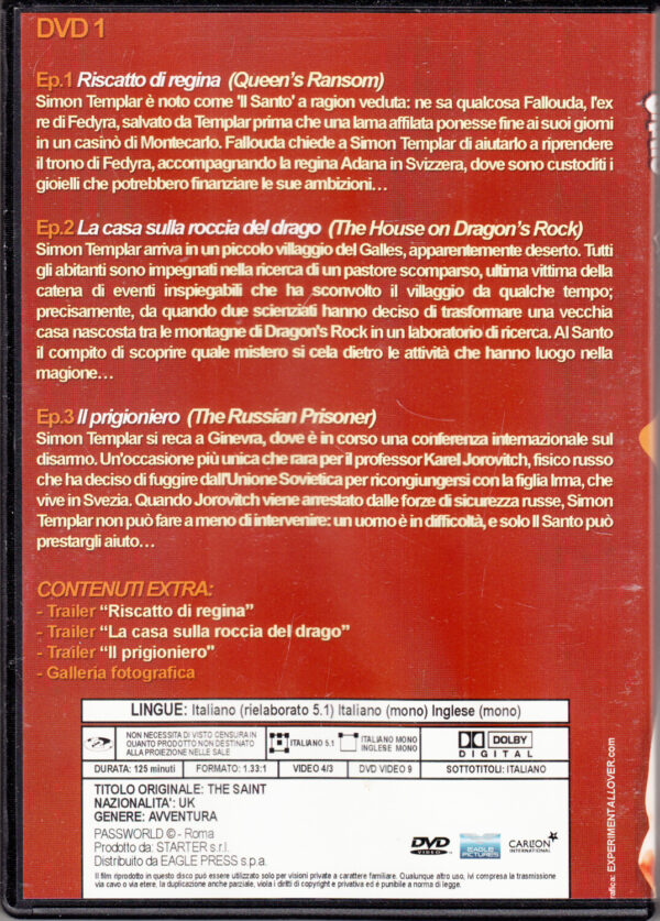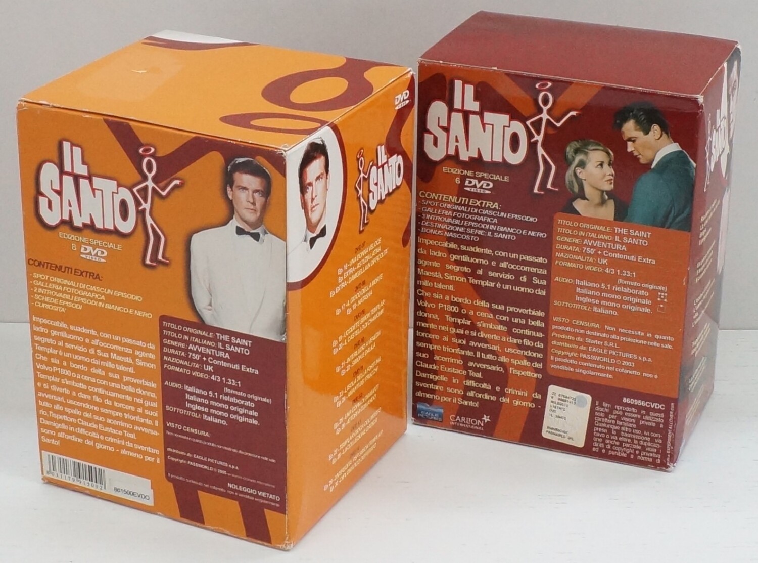 | Il Santo, edizione Speciale. Questa serie speciale è un mix di episodi delle stagioni 1, 2, 3, 5, 6 (La stagione 5 è quasi completa). I titoli presenti divisi per stagione sono i seguenti: Prima stagione: Un marito di talento, La freccia mortale, Astuzia latina. Seconda stagione: Rivale pericolosa. Terza stagione: Damigella in difficoltà. Quinta stagione: Riscatto di Regina, Il prigioniero, Un paese turbolento, Il tesoro del pirata, Il comodo mostro, L’occhio d’angelo, L’uomo che amava i leoni, Trappola per topi, Una fanciulla smarrita, La scritta segreta, Come rubare un aereo, La gang delle evasioni, Il primo ministro Liskard, Una donna veloce, Il gioco della morte, Natasha, Uccidete Simon Templar, Il castello di Chamonix, Interludio a Venezia, Simon e Dalila, L’isola della fortuna, Amanti dei trucchi, Una copia in diamanti, Attori a comando, Templar gioca col morto. Sesta Stagione: La casa sulla roccia del drago, L’uomo che giocò con la vita, La collezione gadica, Un’eredità per Simon Templar, Diplomatico disperato. |