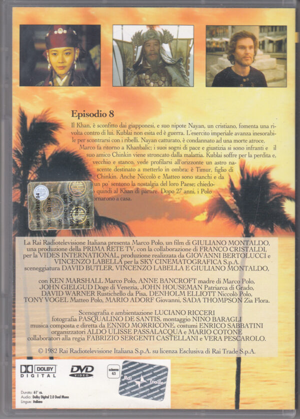 La raccolta completa si compone di 18 dvd: dal 1-6 Sandokan, dal 7-14 Marco Polo, dal 15-18 Cristoforo Colombo. In vendita c’è la serie degli 8 episodi completi di Marco Polo dal disco 7 al disco 14 dell’intera raccolta. |