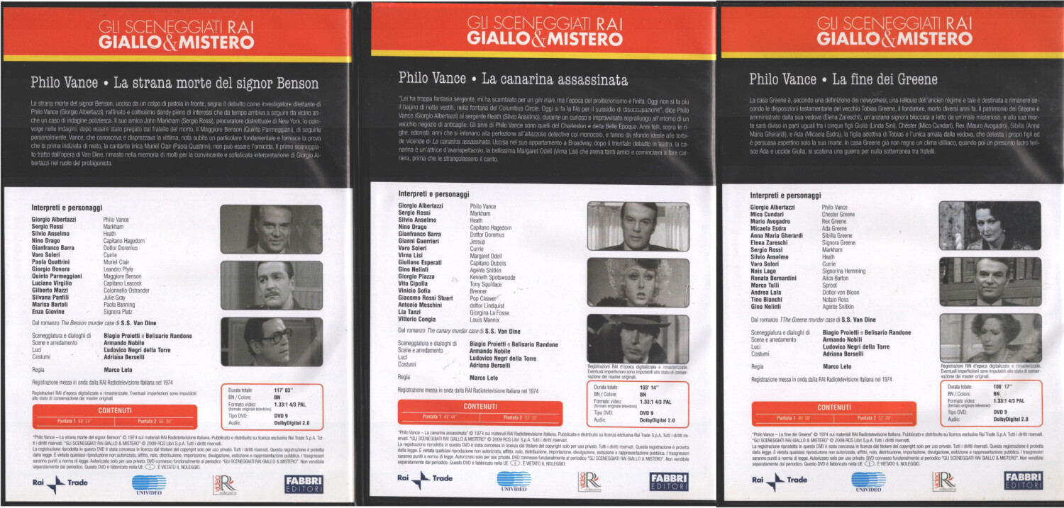 | Titolo: | Philo Vance – DVD RAI (Strana morte signor Benson, Canarina Assassina, Fine dei Greene) Miniserie Completa (Episodi 6) (3 DVD) Sceneggiati Giallo & Mistero – Versione da edicola – DVD in Italiano |