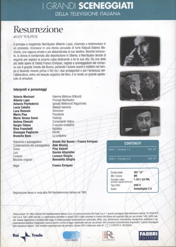| Titolo: | Resurrezione (Lev Tolstoj) Miniserie TV Completa DVD RAI (Episodi 1-6) I grandi Sceneggiati RAI – Versione da edicola DVD in Italiano |