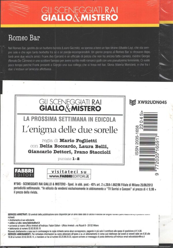 | Titolo: | Romeo Bar – Miniserie TV Completa DVD RAI (Episodi 1-2) Sceneggiati Rai Giallo & Mistero – Versione da edicola – DVD in Italiano |