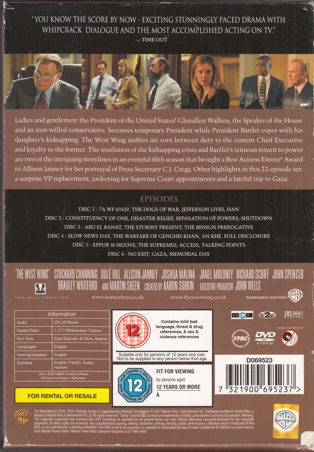 | Titolo: | The West Wing. Complete Season 5 (Episode 1-22) con n. 6 DVD Edizione Regno Unito PAL Regione 2, Lingua Inglese con Cofanetto |