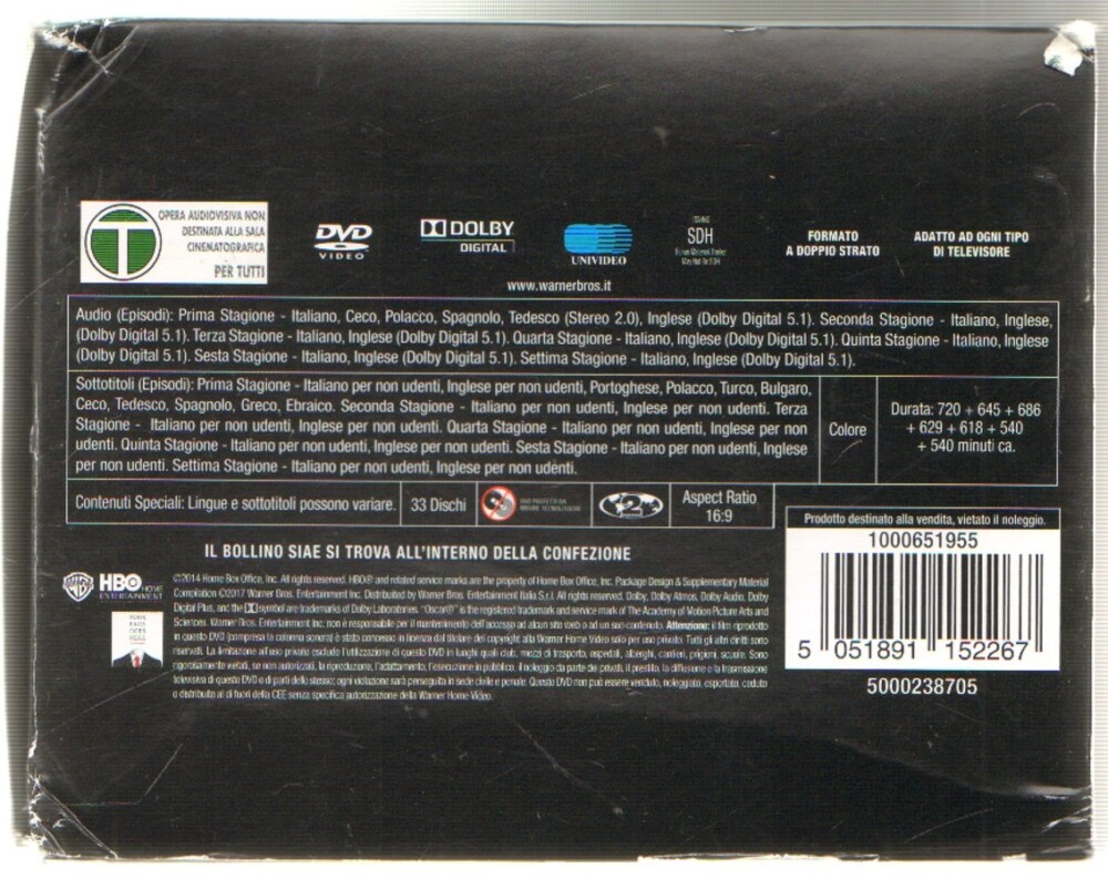 Dischi: Ottime condizioni (8 dischi hanno qualche leggerissimo graffietto, i restanti sono come nuovi perfetti, sono tutti perfettamente funzionanti). Libretti: non presenti. Sono inclusi tutti i 33 DVD della stagioni dalla prima alla settima. |