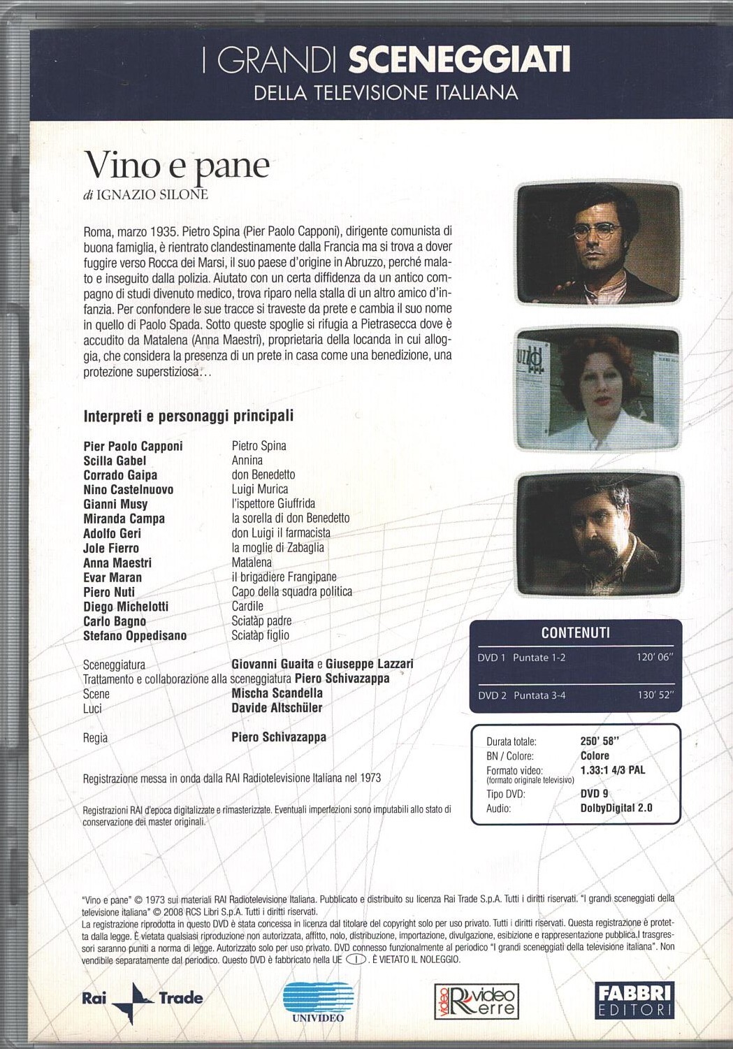 | Titolo: | Vino e pane – Miniserie Completa DVD RAI – (Episodi 1-4) (2 DVD) Grandi Sceneggiati Rai – Versione da edicola – DVD in Italiano |