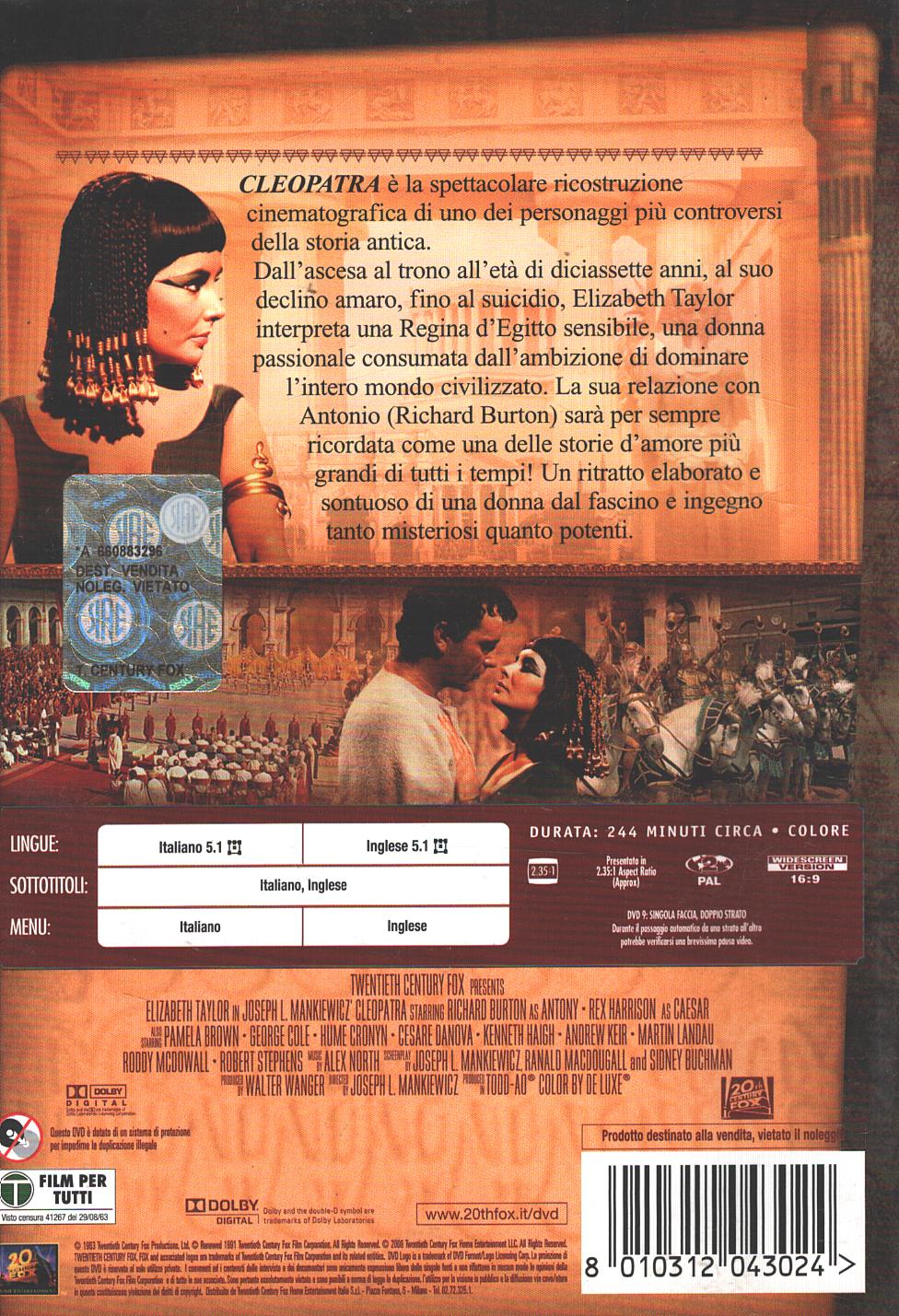 | Titolo: | Cleopatra (Elizabeth Taylor) – Edizione (2 DVD) Senza Slipcase – DVD in Italiano |