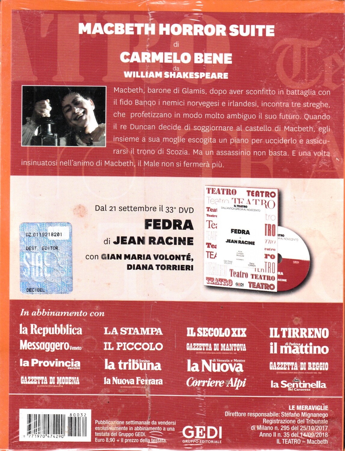 | Titolo: | Macbeth Horror Suite di Carmelo Bene. Teatro dall’Antica Grecia al Novecento vol. 32. DVD in Italiano. Versione da edicola |