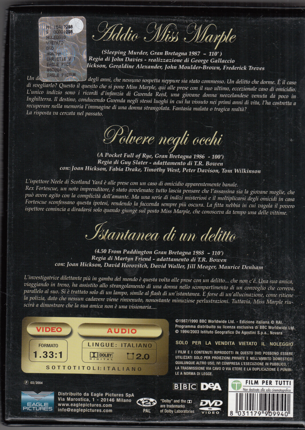 | Descrizione: | I film inclusi sono: Addio Miss Marple, Polvere negli occhi, Istantanea di un delitto |