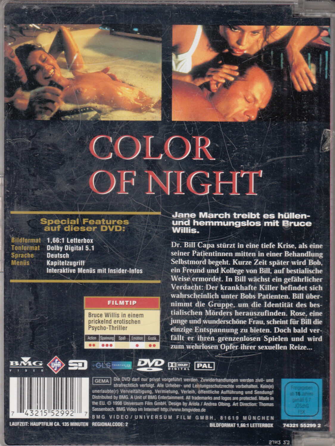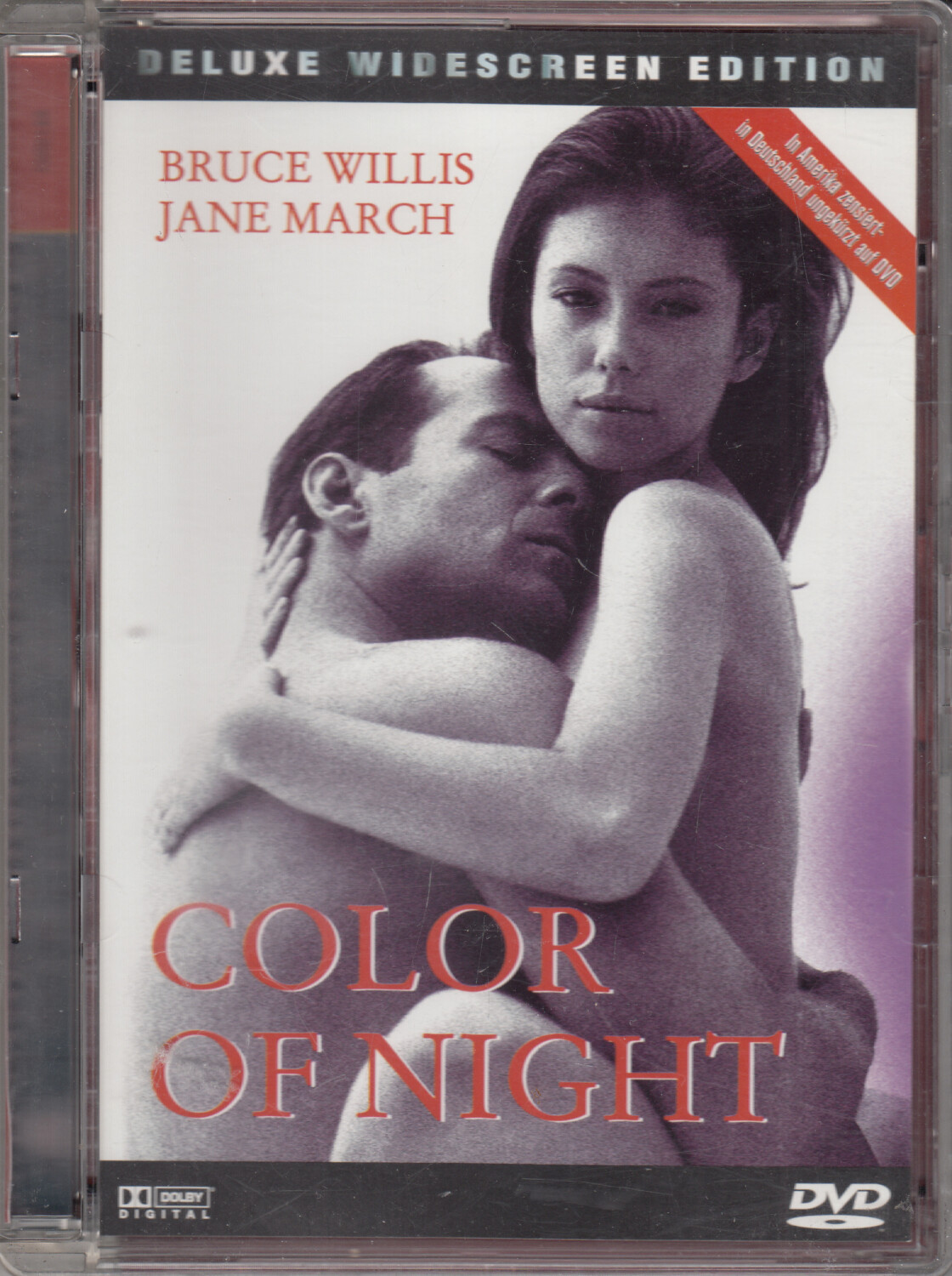 | Titolo: | Color of Night (Bruce Willis) – DVD Edizione Germania PAL Regione 2, Lingua Tedesco. Custodia Jewel Box |