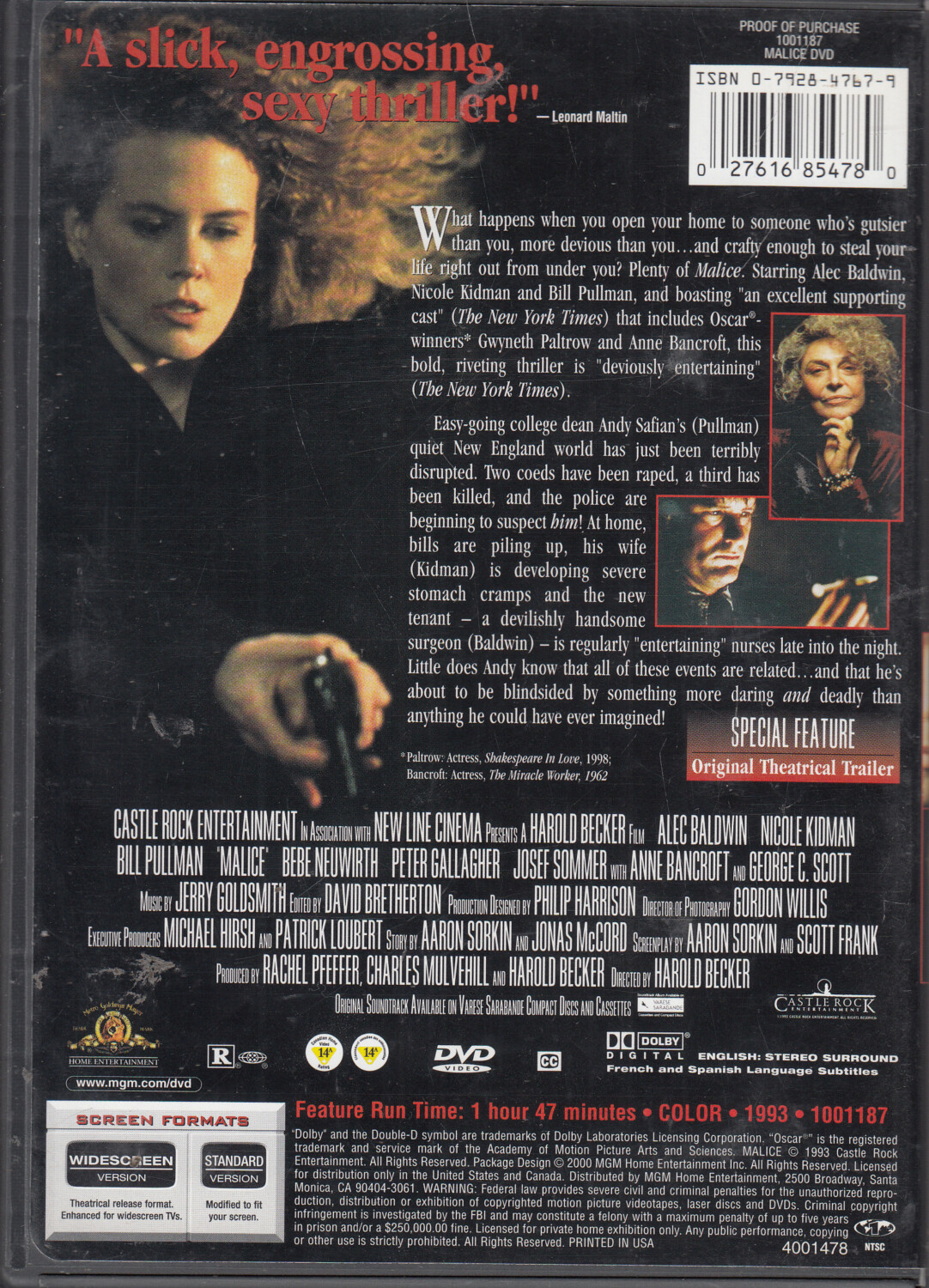 | Titolo: | Malice DVD (Il sospetto) (Alec Baldwin, Nicole Kidman) (Edizione Regno Unito) DVD in Inglese |