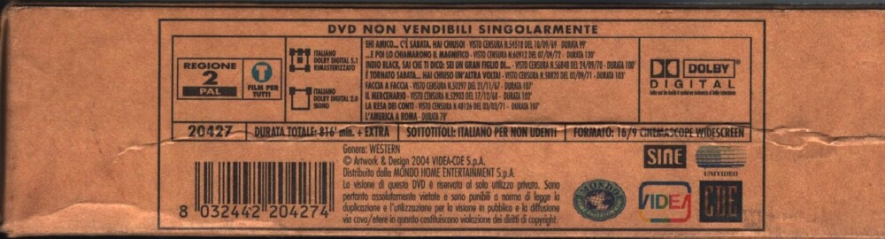 | I film inclusi in questo cofanetto sono: …e poi lo chiamarono il Magnifico – Ehi, amico…c’è Sabata, hai chiuso! – E’ tornato Sabata, hai chiuso un’altra volta – Indio Black, sai che ti dico: sei un gran Figlio di…. – Il Mercenario – La resa dei conti – Faccia a faccia – L’America a Roma | |