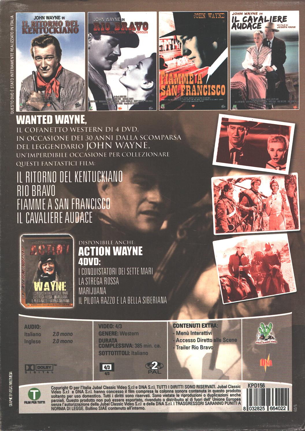 | Descrizione: | I film inclusi sono: Il ritorno del Kentuckiano – Rio Bravo – Fiamme a San Francisco – Il cavaliere audace |