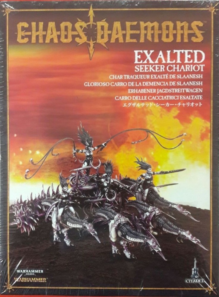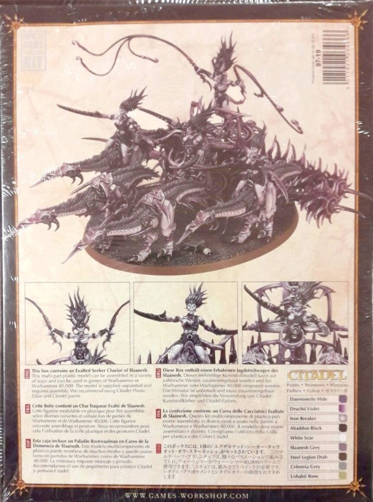 | La confezione contiene un Carro delle Cacciatrici Esaltate di Slaanesh. Questo kit multicomponente di plastica può essere assemblato in diversi modi e usato nelle partite a Warhammer e Warhammer 40.000. Il modello deve essere assemblato e dipinto. Consigliamo l’utilizzo della Colla per plastica e dei colori Citadel.