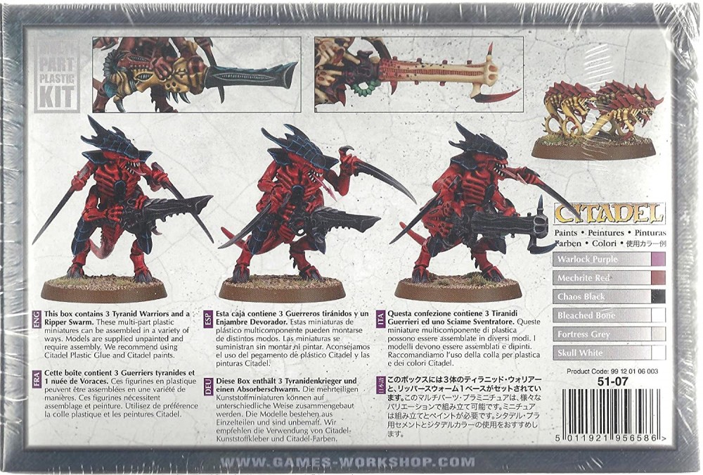 | La confezione contiene 3 Tiranidi Guerrieri ed uno Sciame Sventratore. Queste miniature multicomponente di plastica possono essere assemblate in diversi modi e devono essere dipinte. Raccomandiamo l’utilizzo della Colla per plastica e dei colori Citadel.