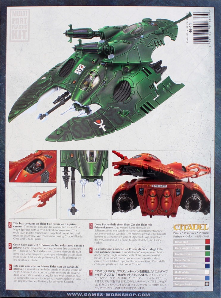 | La confezione contiene un Prisma di Fuoco degli Eldar con cannone prisma. Il modello può essere assemblato come un Tessinotte degli Eldar con un tessifato binato. Questo kit multicomponente di plastica deve essere assemblatao e dipinto. Raccomandiamo l’utilizzo della Colla per plastica e dei colori Citadel.