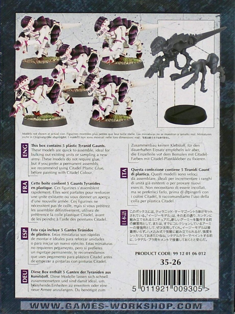 | La confezione contiene 5 Tiranidi Gaunt di plastica da assemblare e dipingere, ideali per incrementare i ranghi di unità già esistenti o per provare nuovi eserciti. Non necessitano di essere incollati, ma se preferisci farlo ti consigliamo l’utilizzo della Colla per plastica e dei colori Citadel.
