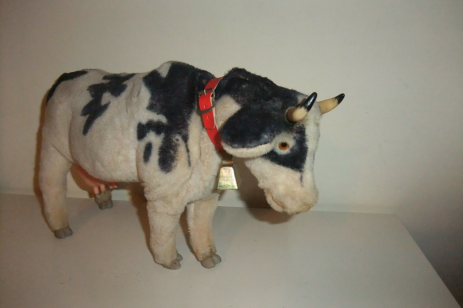 Giocattolo originale anni ’50/60, MADE in JAPAN Ha un meccansimo a pile NON funzionante (da rivedere e risistemare) con il quale dovrebbe muggire e muovere la testa (con conseguente rumore del campanello in metallo appeso al collo). Le mammelle sotto le quali è allocato l’apposito spazio per le batterie sono state reincollate diverse volte ed hanno residui di colla, vanno risistemate meglio. La mucca ha una lunghezza di cm 35 (senza tener conto della coda) ed un’altezza di circa cm 20 |