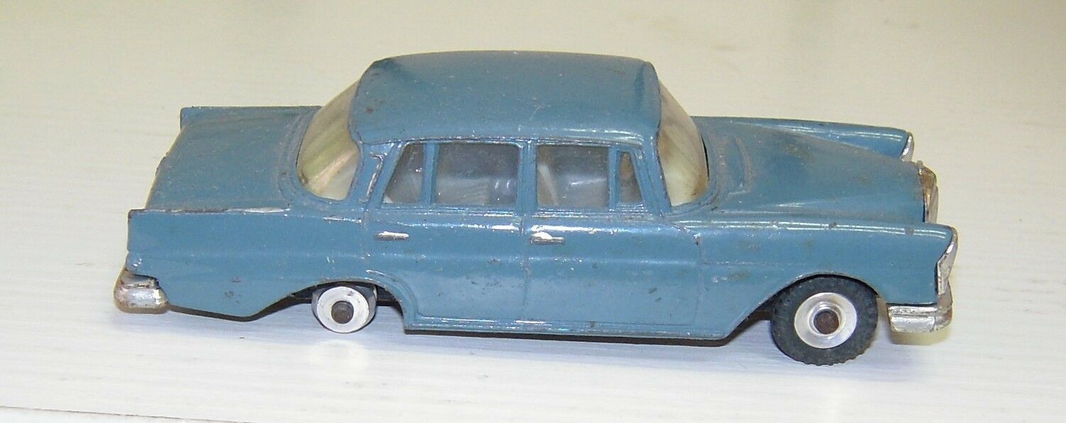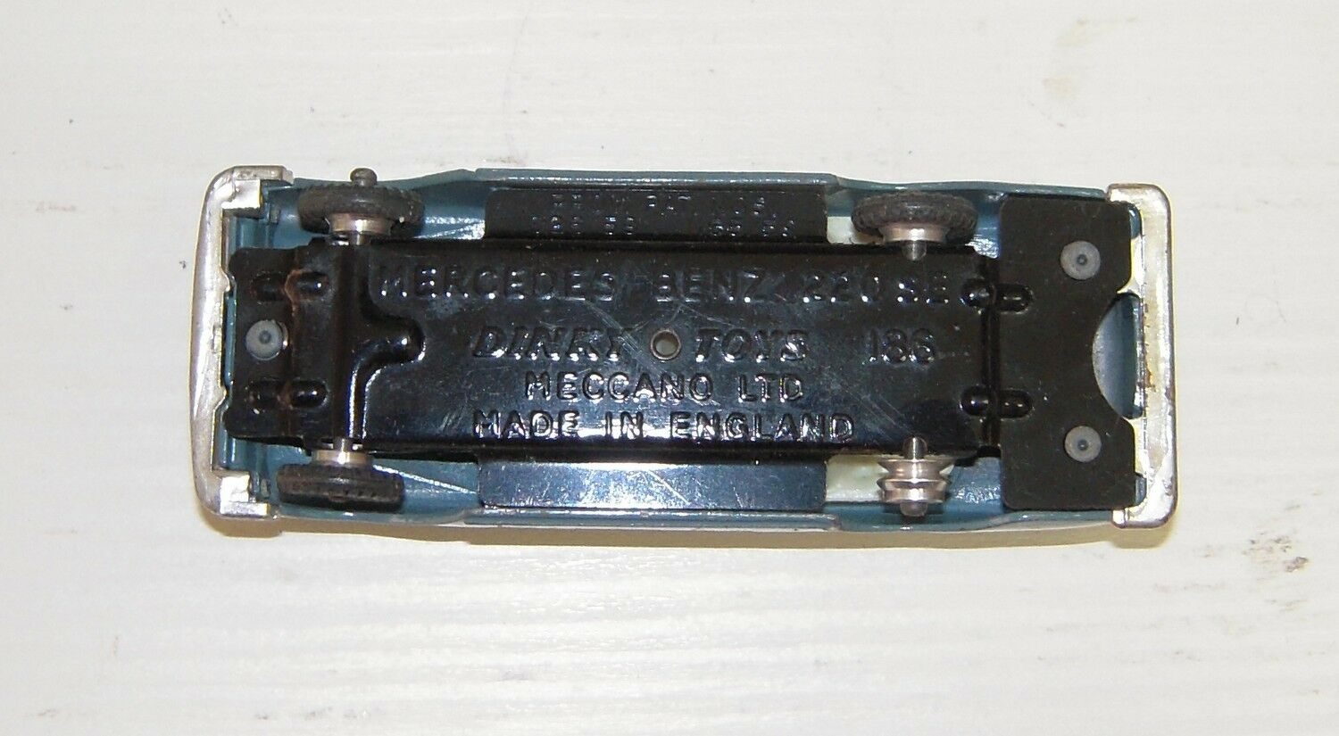 MERCEDES BENZ 220 SE. 186. Made in England. Dinky Toys Modellino Auto Anni ’60. Scala 1:43. Auto vintage originale degli anni ’60. Non è una riproduzione. Colore blu. Lunghezza 10,20 cm. Interni presenti di colore avano chiaro, ruote con ammortizzatori.