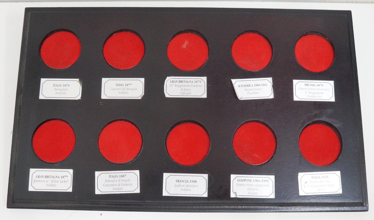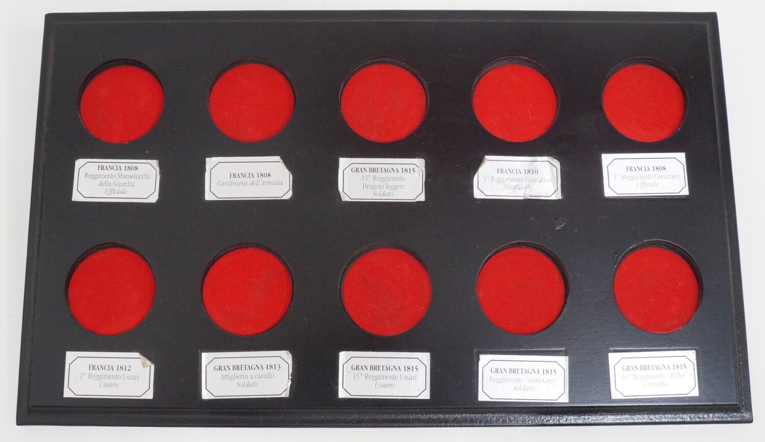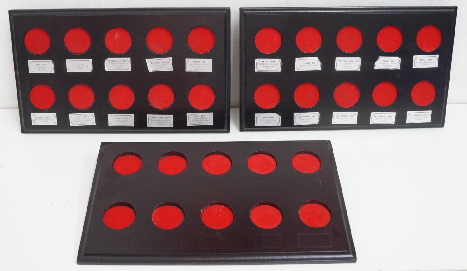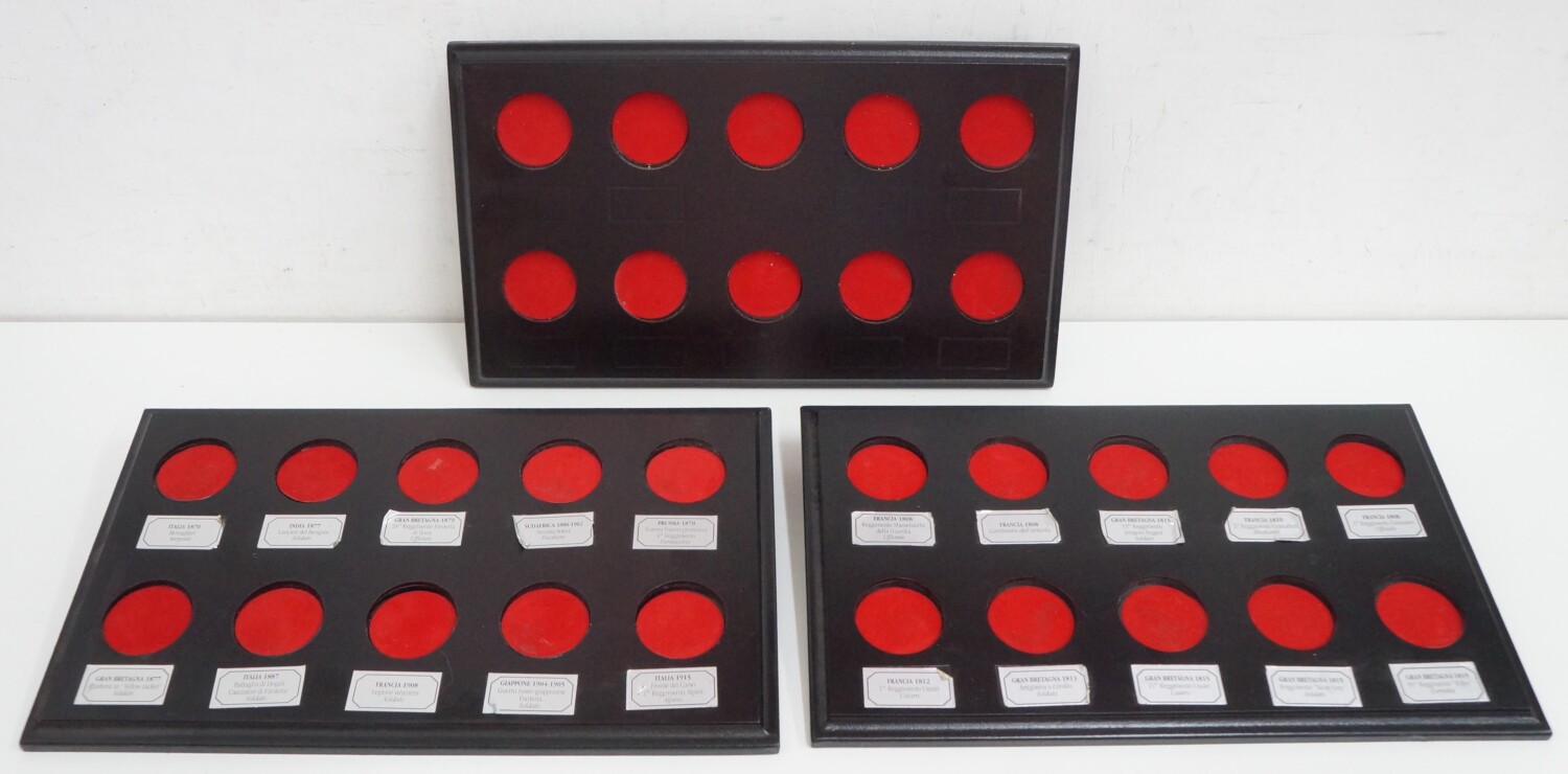 | Tre espositori compresi. NOTA BENE: In uno dei tre espositori mancano gli adesivi con il nome dei soldatini sulla base in legno, le altre due sono complete di adesivi un po’ staccati in alcuni punti. E’ incluso tutto come da foto. |