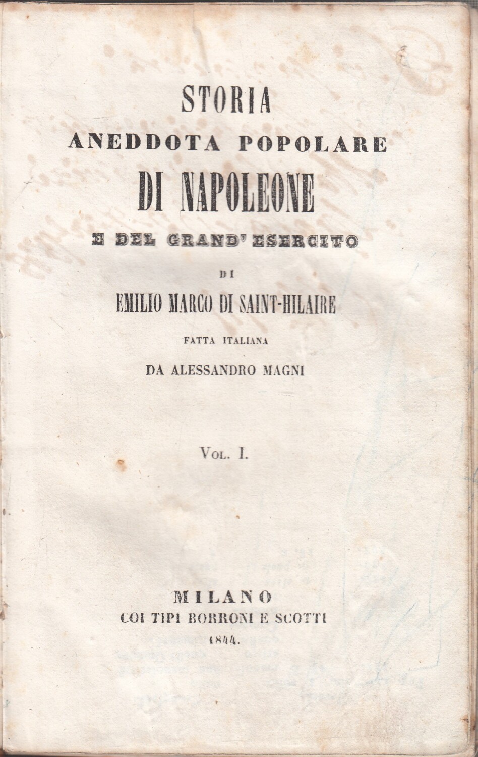 | Titolo: | Storia Aneddota Popolare di Napoleone e del grande esercito vol. 1 di Emilio Marco di Saint Hilaire ed. 1844 Borroni e Scotti |