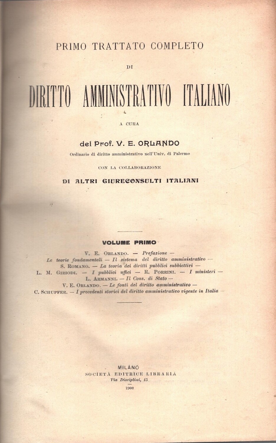 | Titolo: | Primo trattato completo di Diritto Amministrativo Italiano (volume primo) di V. E. Orlando ed. Società Editrice Libraria (1900) |