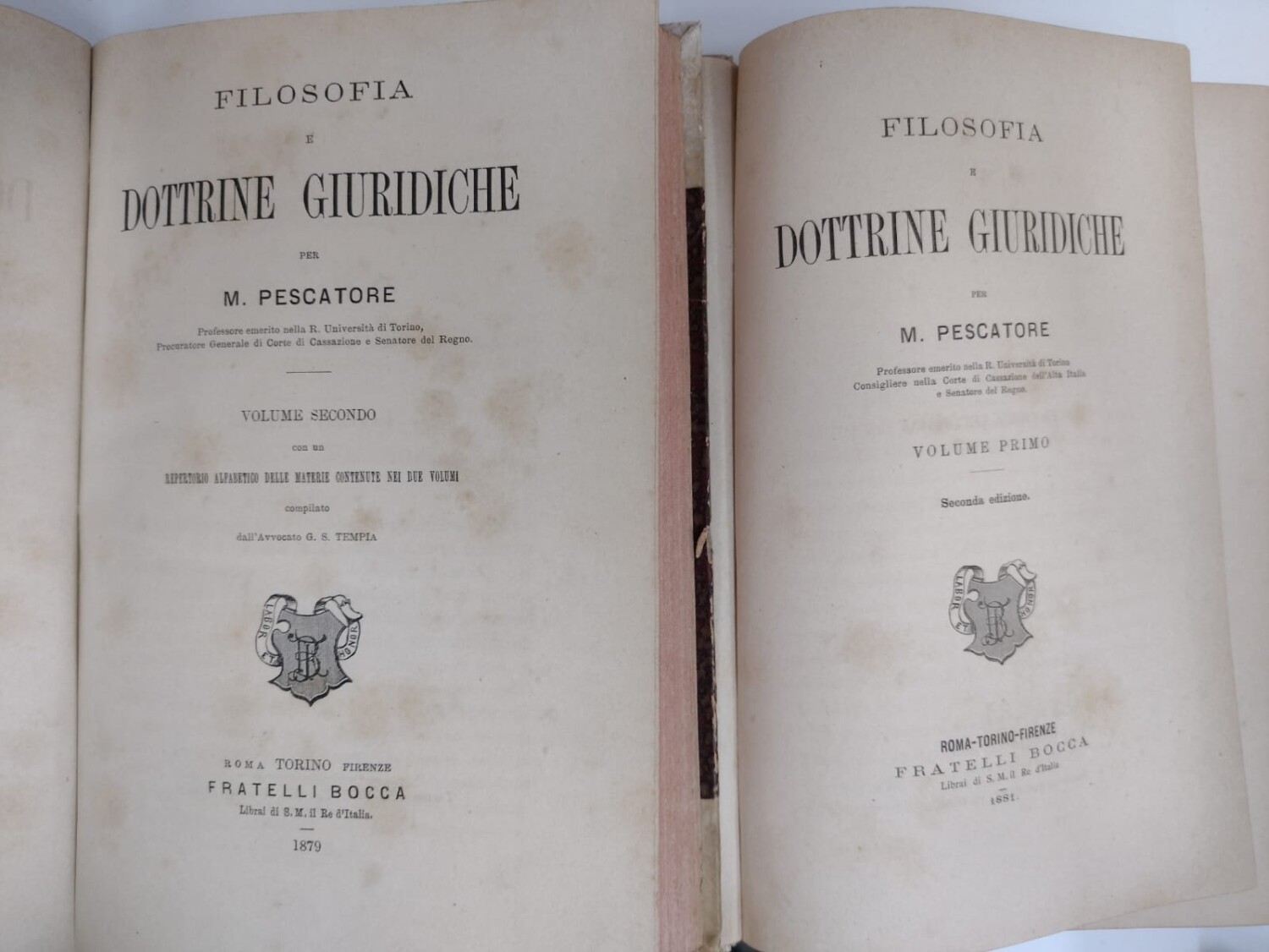 | Titolo: | Filosofia e Dottrine Giuridiche (2 volumi) di M. Pescatore ed. Fratelli Bocca (1879-1881) |