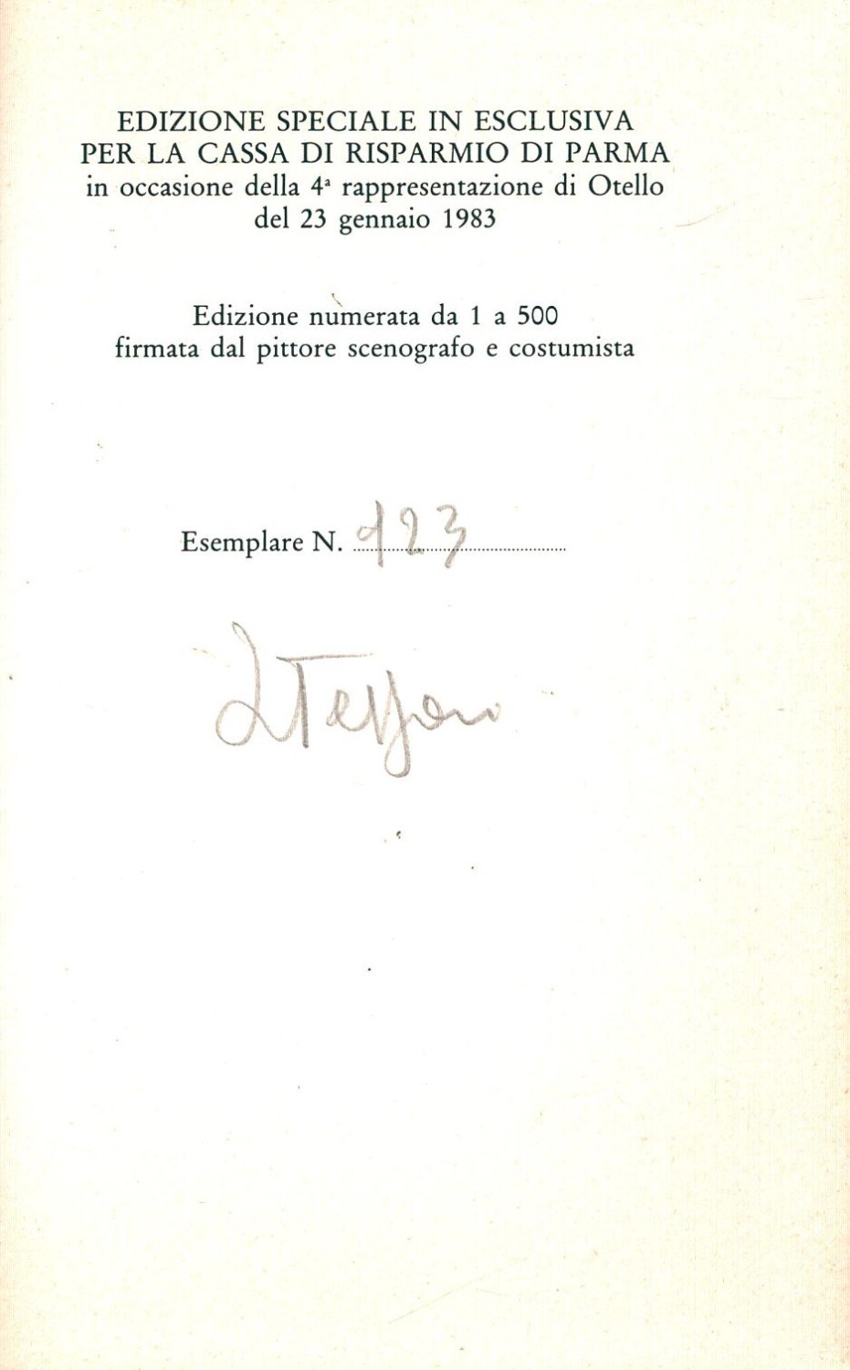 Otello – versi di Arrigo Boito musiche di Giuseppe Verdi. Ristampa Anastatica in Edizione Limitata e Numerata firmata dal pittore scenografo Luigi Tessoni ed. Cassa di Risparmio di Parma (1983)