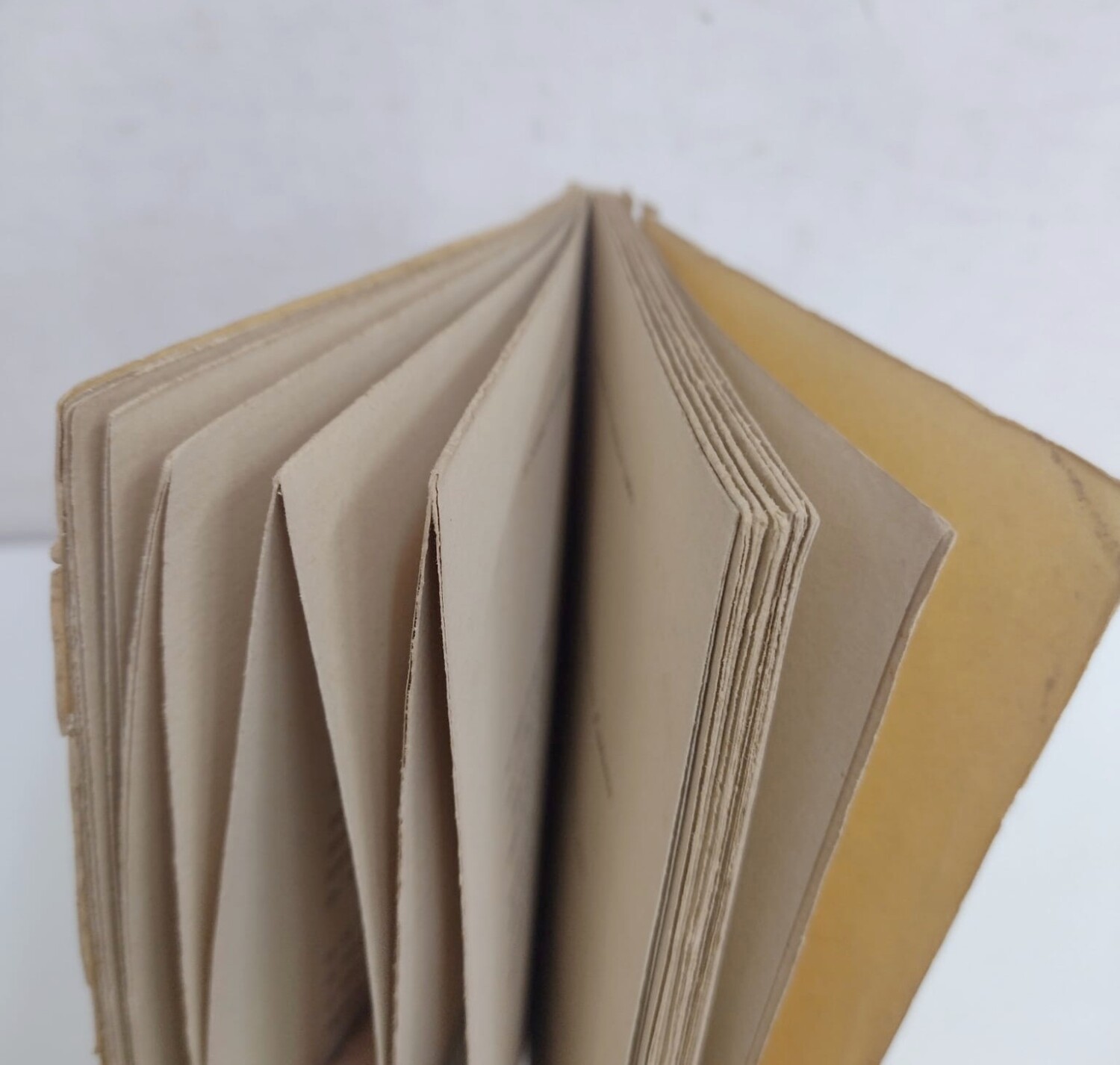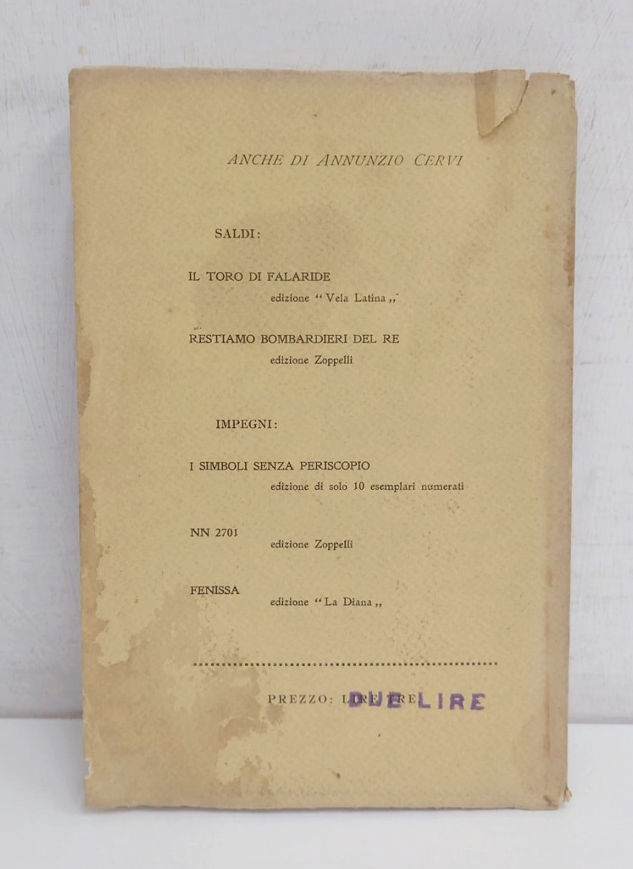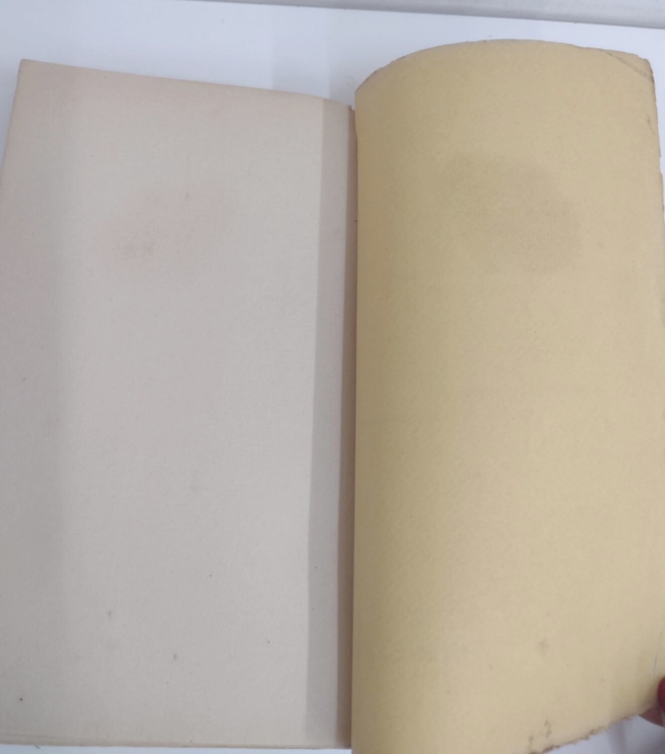 Nessuna scritta. Copertina: condizioni buone, ha un po' di usura e piccoli strappi ai bordi, macchia di umidità sulla copertina posteriore e leggerissimi aloni in terza di copertina e sull'ultima pagina, strappetto con mancanza sulla parte superiore del dorso. Pagine: condizioni buone, sono un po' ingiallite ed hanno macchioline di ingiallimento (fioriture), pagine intonse ancora da tagliare sulla parte superiore.
