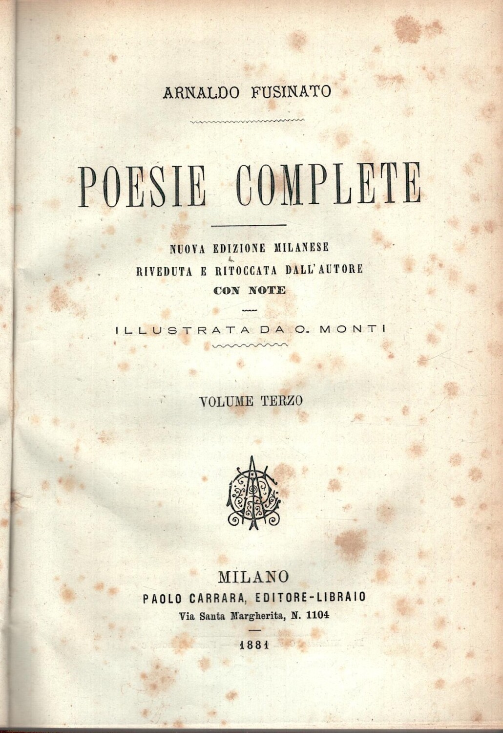 | Titolo: | Poesie patriottiche complete volume terzo di Fusinato Arnaldo ed. Paolo Carrara (1881) |