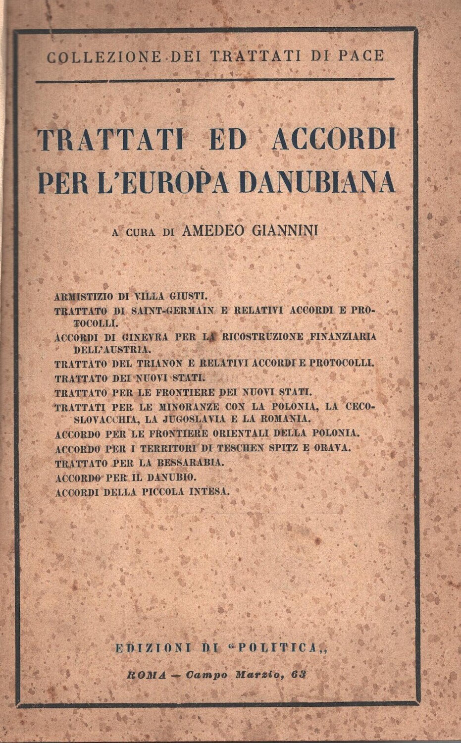 Trattati ed accordi per l’Europa Danubiana a cura di Amedeo Giannini ed. Edizioni di Politica