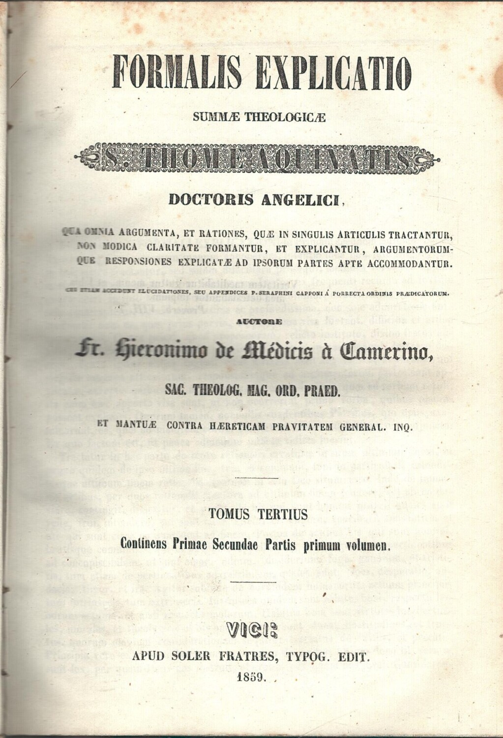Formalis explicatio Summae Theologicae S. Tomae Aquinatis (vol. 3) di Gieronimo De Medicis – In Latinto ed. Soler Fratres (1859)