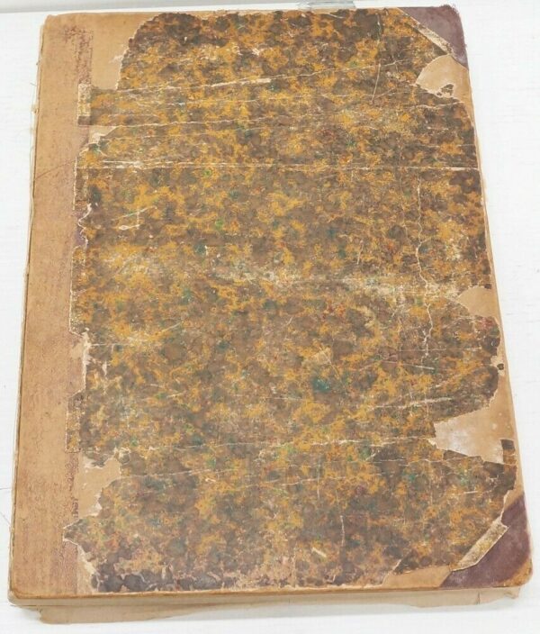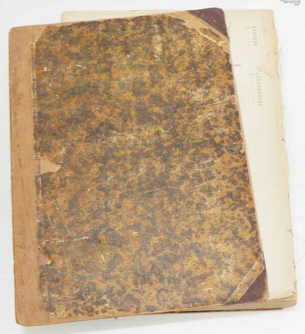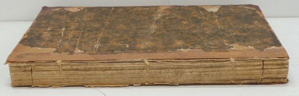 | La copertina artigianale e’ molto usurata, il dorso e’ completamente assente, ci sono molte mancanze ed abrasioni. La copertina anteriore e’ allentata, la copertina posteriore e’ completamente distaccata. La rilegatura e’ molto allentata e un paio di pagine sono completamente distaccate ma nessuna mancante. E’ evidente che il libro e’ da restaurare. |