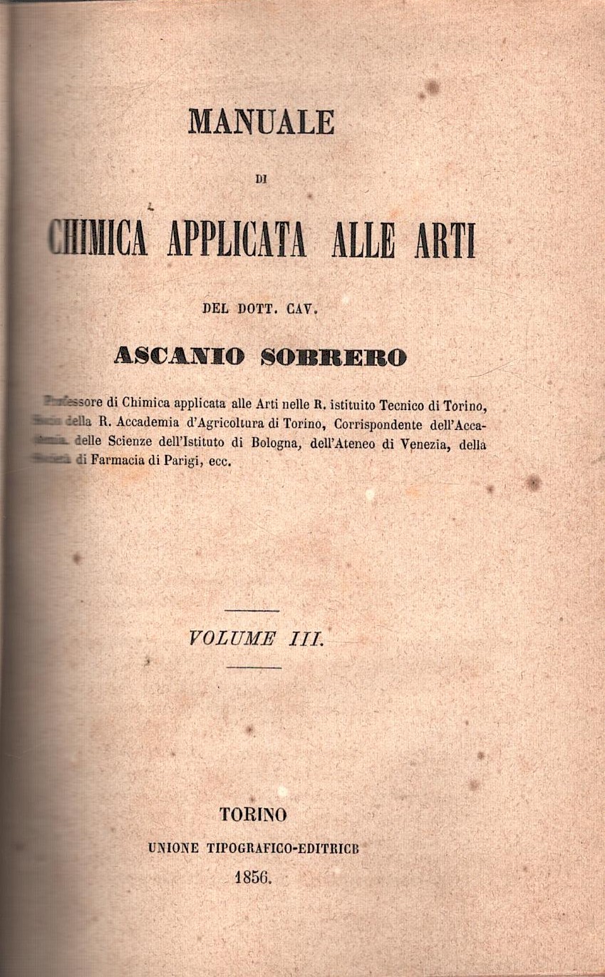 | Titolo: | Manuale di Chimica applicata alle arti (vol. 3) di Ascanio Sobrero ed. Unione Tipografica Editrice (1956) |