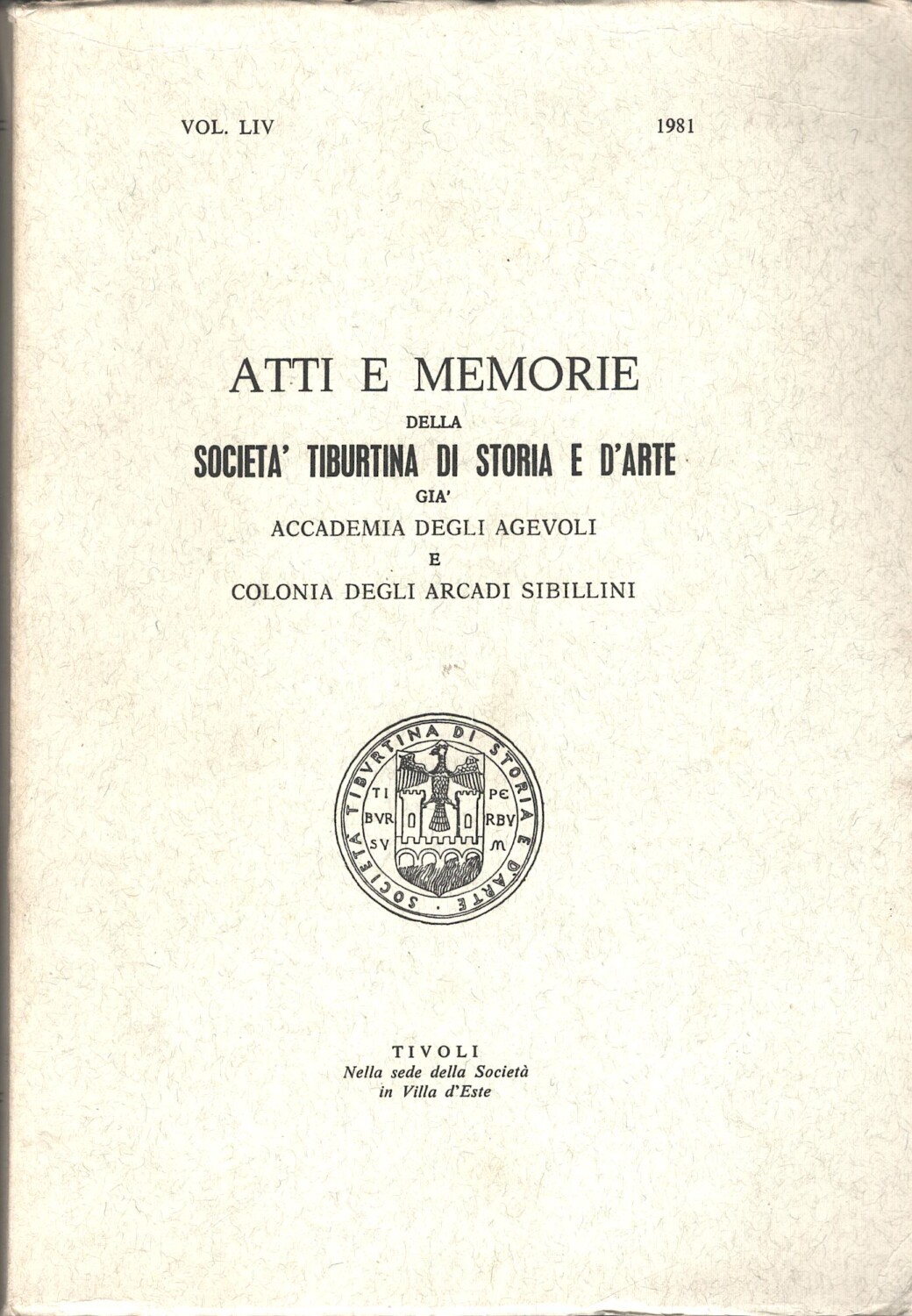 Atti e Memorie della Società Tiburtina di Storia e d’Arte vol. LIV – 1981 di AA.VV. ed. Società Tiburtina di Storia e d’Arte