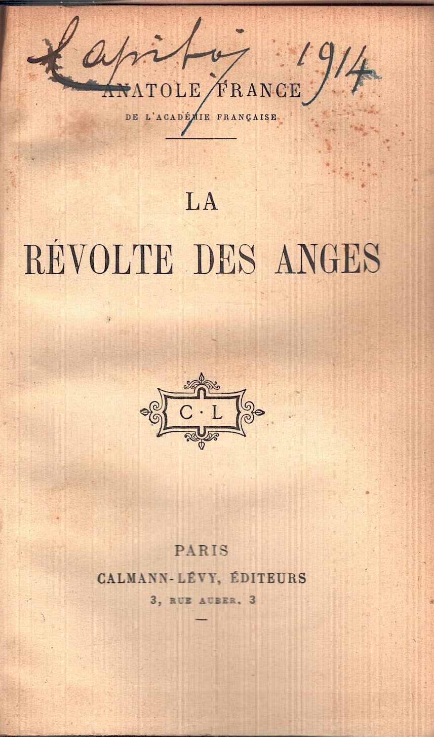 | Titolo: | La Revolte des anges di Anatole France – In Francese ed. Calmann Levy (1914) |