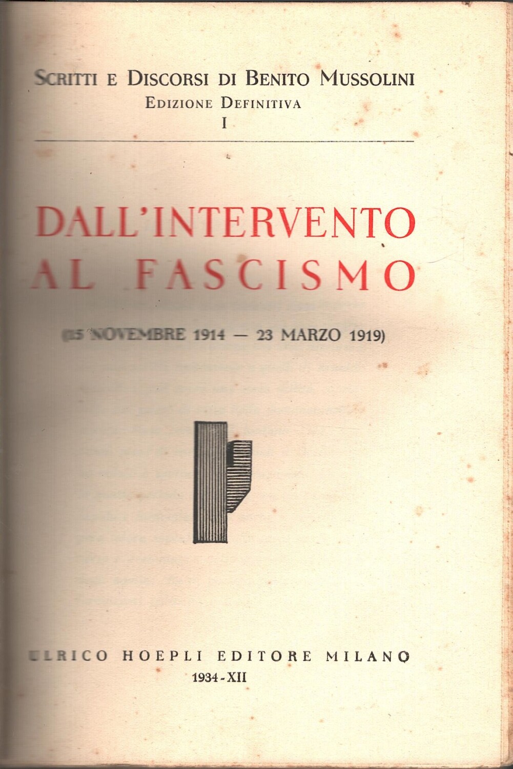 Scritti e discorsi di Benito Mussolini (vol. 1) Dall’intervento al Fascismo (15 Novembre 1914-23 Marzo 1919) di Mussolini, Benito ed. Hoepli