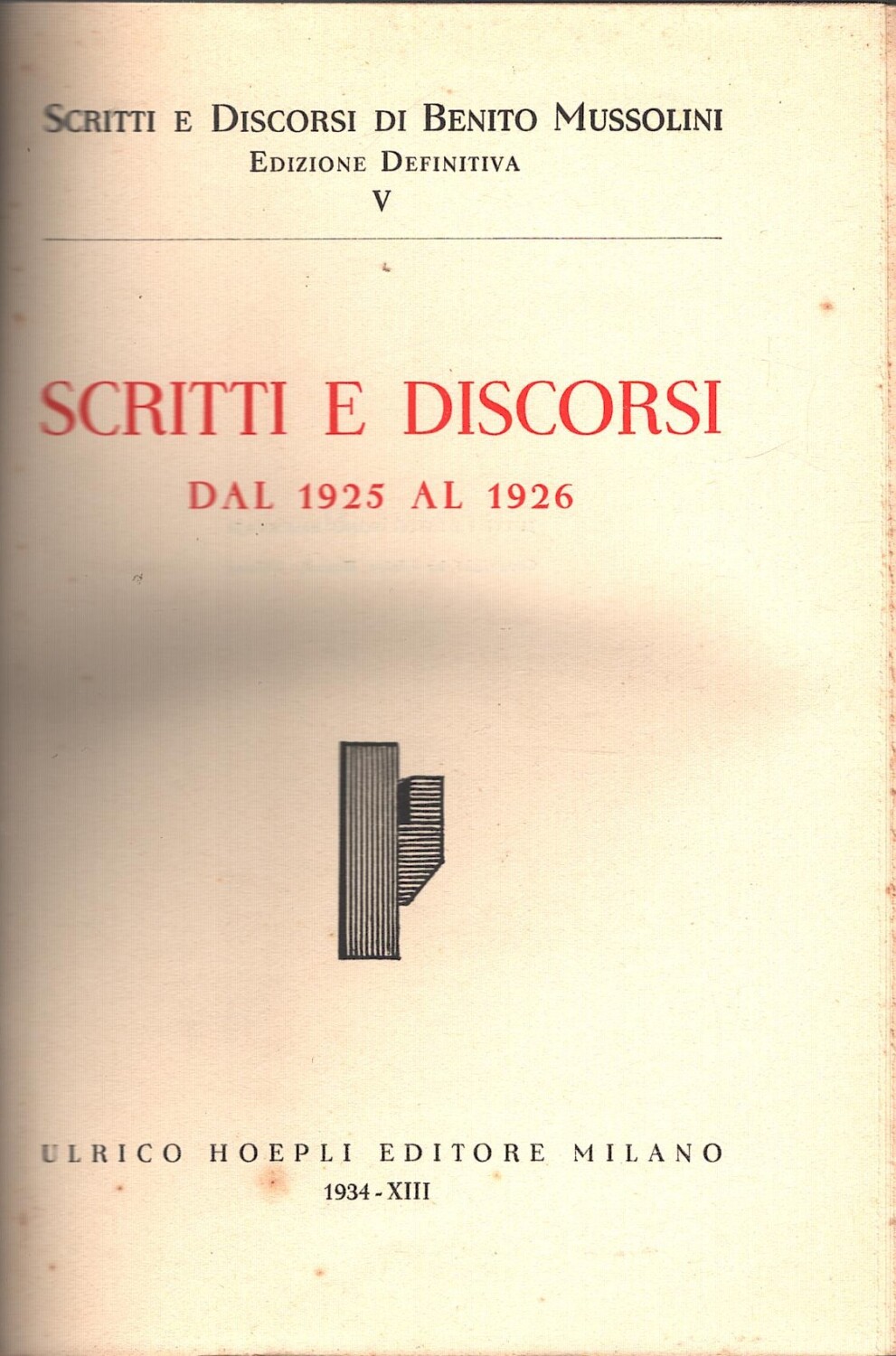 | Titolo: | Scritti e discorsi di Benito Mussolini (vol. 5) Scritti e Discorsi dal 1925 al 1926 di Mussolini, Benito ed. Hoepli |