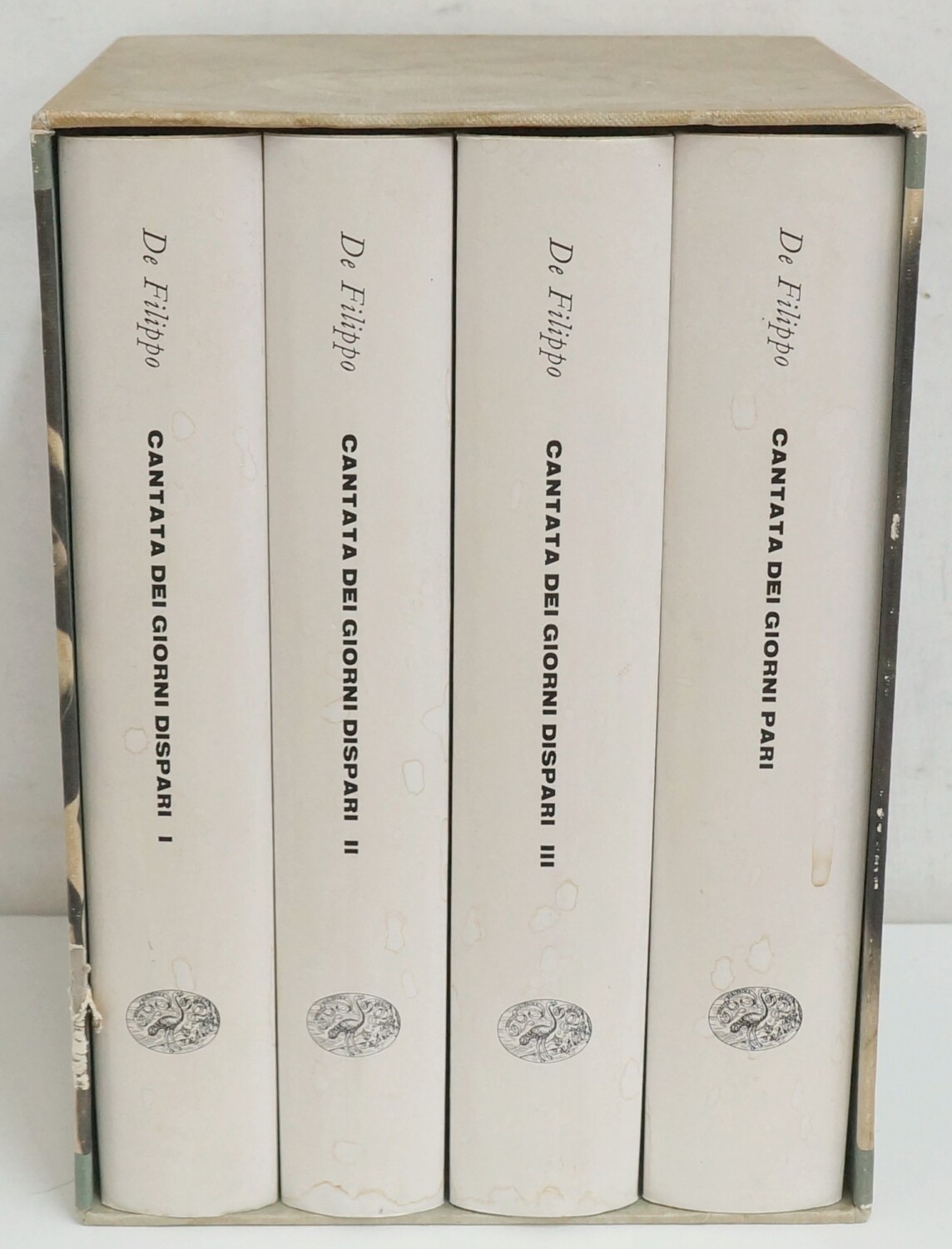 Nessuna scritta e Nessuno strappo. Copertine: condizioni buone, hanno un po' di usura ai bordi e macchioline di ingiallimento. Pagine: condizioni buone, hanno evidenti macchioline di ingiallimento. Con cofanetto in cartoncino che presenta un po' di usura ai bordi, una macchia sulla parte superiore e macchioline di ingallimento sulla parte interna.