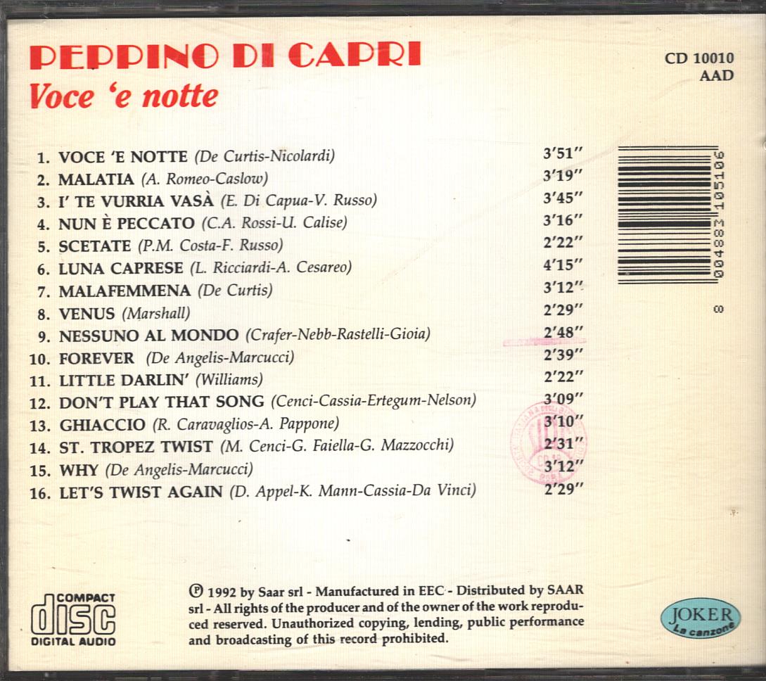 | Titolo: | Voce ‘e notte di Peppino di Capri – CD Audio (CD 10010) |